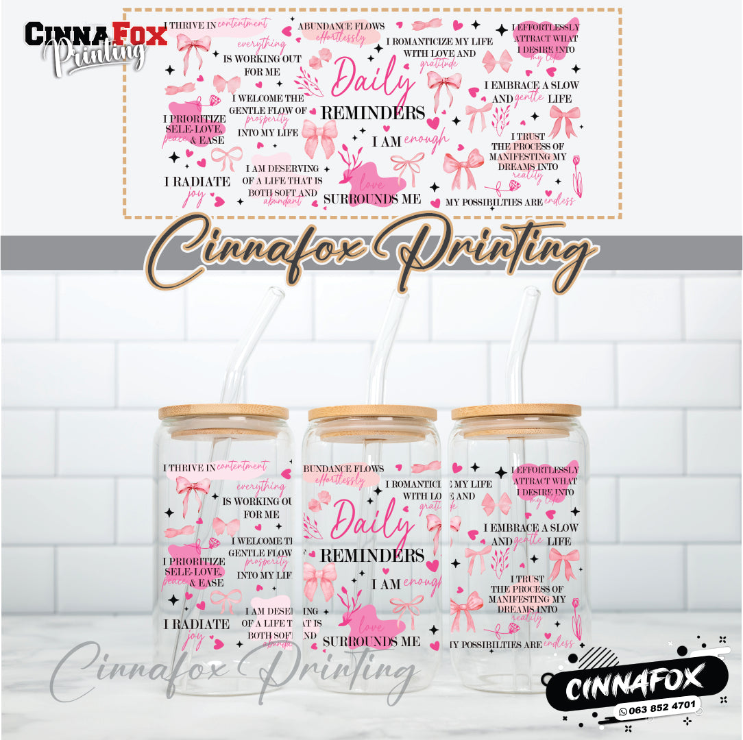 Assorted daily Reminders Pink Glass Cup With Lid & Straw