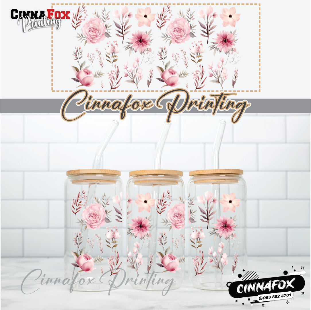 Floral Pink Wrap Glass Cup With Lid & Straw